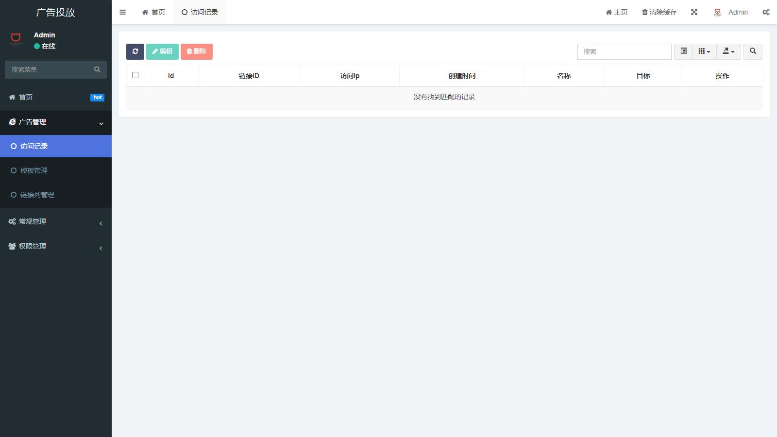 这是一套广告跳转统计系统,基于ThinkPHP5.0框架,支持实时分析广告页面数据,可选择生成html页面样式,可自定义设置页面域名后缀,可指定跳转网址,可记录单个页面的访问记录,可对生成的单个链接进行备注,可自定义等待时间进行跳转,等等。
