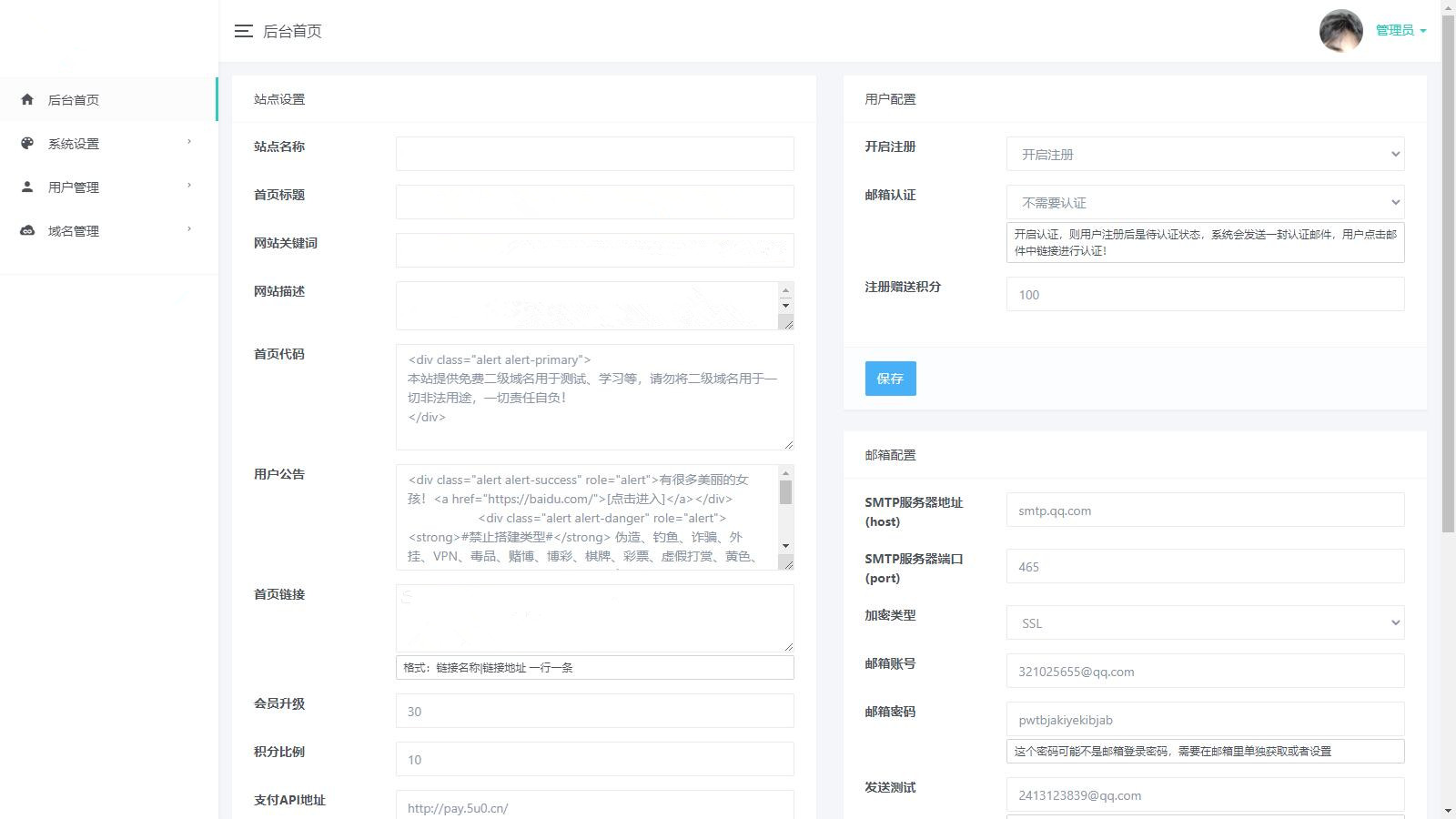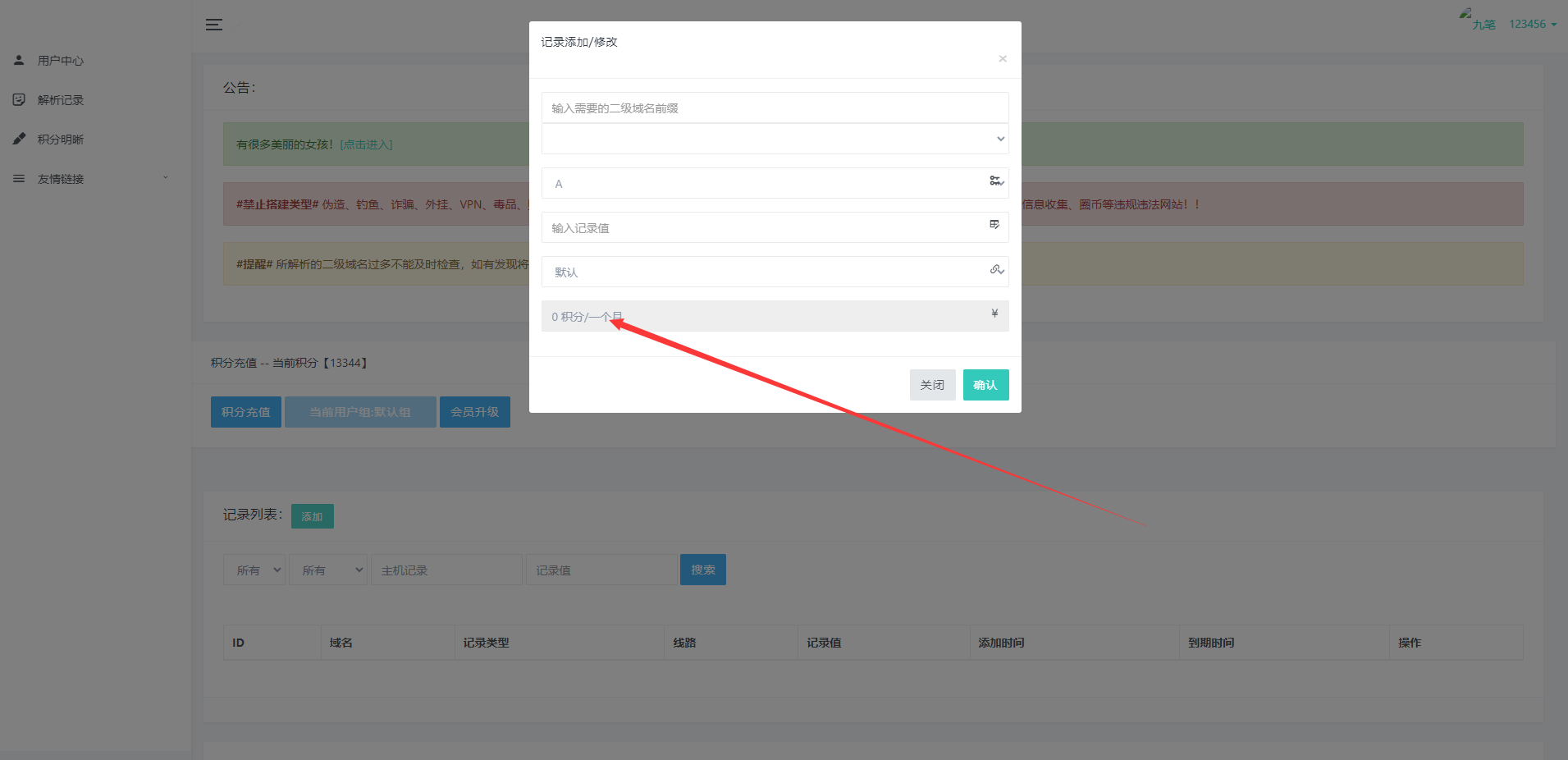 这是一套二级域名租用源码(二级域名分发系统),支持开通VIP会员,支持普通用户免费使用,使用普通域名引流,支持会员租用备案域名,解析设置金币价格,到期自动删除解析,等等。测试环境:nginx1.2.0+php7.0+mysql5.6,需要安装sg15扩展。