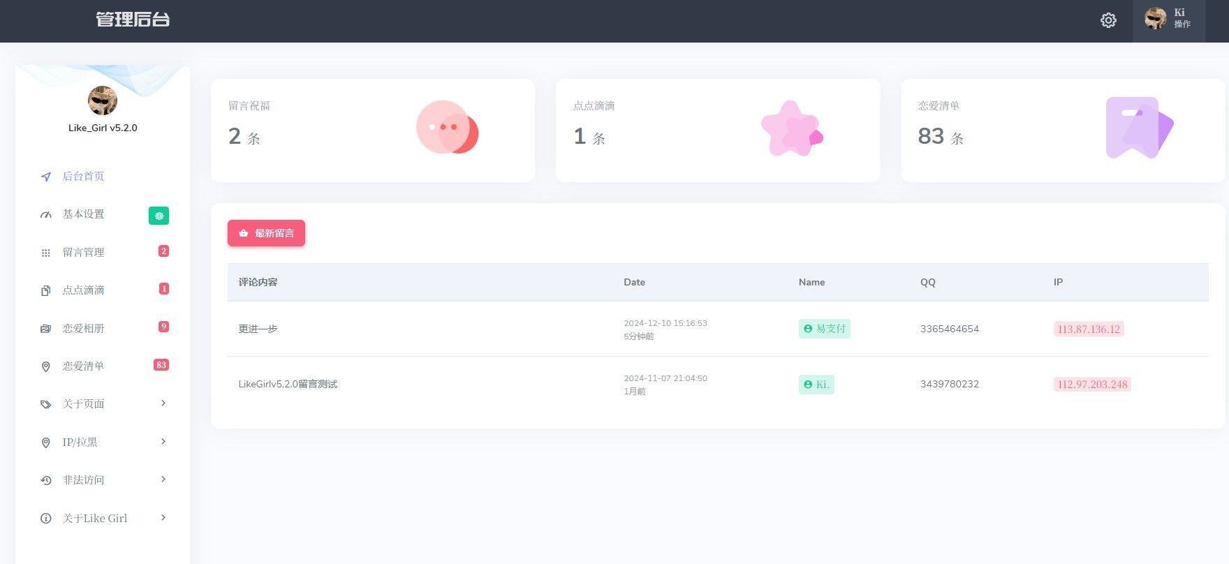这是情侣恋爱主题源码(LikeGirl),可以用来纪念情侣恋爱过程,也是该源码的最终版(V5.2.0),开发截止时间2024年11月7日,测试环境:Nginx+php7.3+mysql5.6。演示站点一https://lovey.kikiw.cn/ 演示站点二https://love.888host.cn/ 2025-01-20查看有效。以前发布的不同版本http://www.txym.cc/9871.html