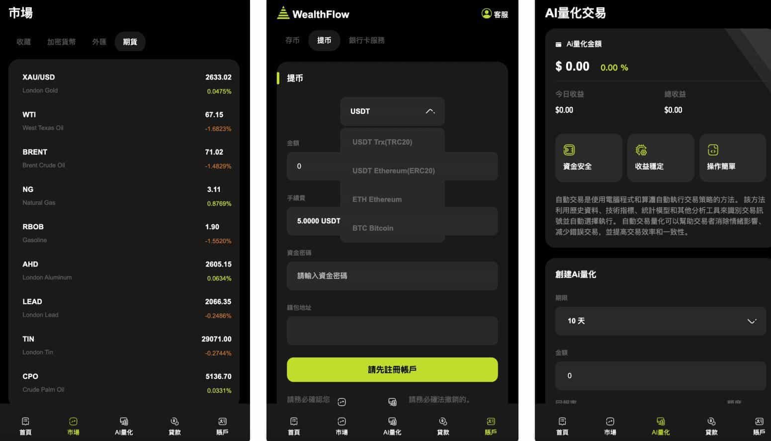 这是一套多语言交易所系统(WealthFlow),后端基于ThinkPHP5.1框架,前端uniapp是编译后的,支持多国语言(6国),拥有加密货币、外汇产品、美股产品、期货产品等功能,并且均可设置期权交易属性,同时也有杠杆交易、借贷、质押等功能,外汇和股票可以根据需要更换接口。源码K线不需要配置服务器环境,只要服务器IP在允许的名单内,前端可以直接调用K线数据,同时支持设置任何币种为平台币,后台可以设置平台币K线,控制分为用户场控(全赢、全输、涨赢跌随机、跌赢涨随机、涨赢跌输、跌赢涨输),杠杆交易也可以控制输赢。此外,前端有试玩账号登录,用户无需注册即可体验。测试环境:Linux系统Ubuntu22+宝塔面板+Nginx+PHP7.2+MySQL5.7,运行目录public,伪静态ThinkPHP,建议开启SSL