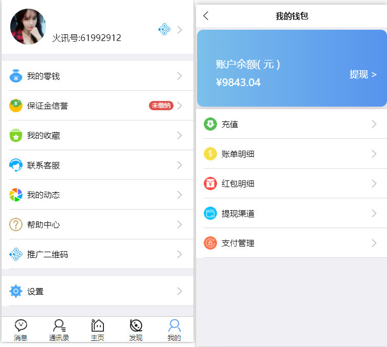 这是一套即时通讯APP源码,功能强大,拥有所有的即时通信功能,自带内嵌web页面,支持红包收发,支持分销功能,支持推广赚钱,支持邀请码,支持缴纳保证金,等等。