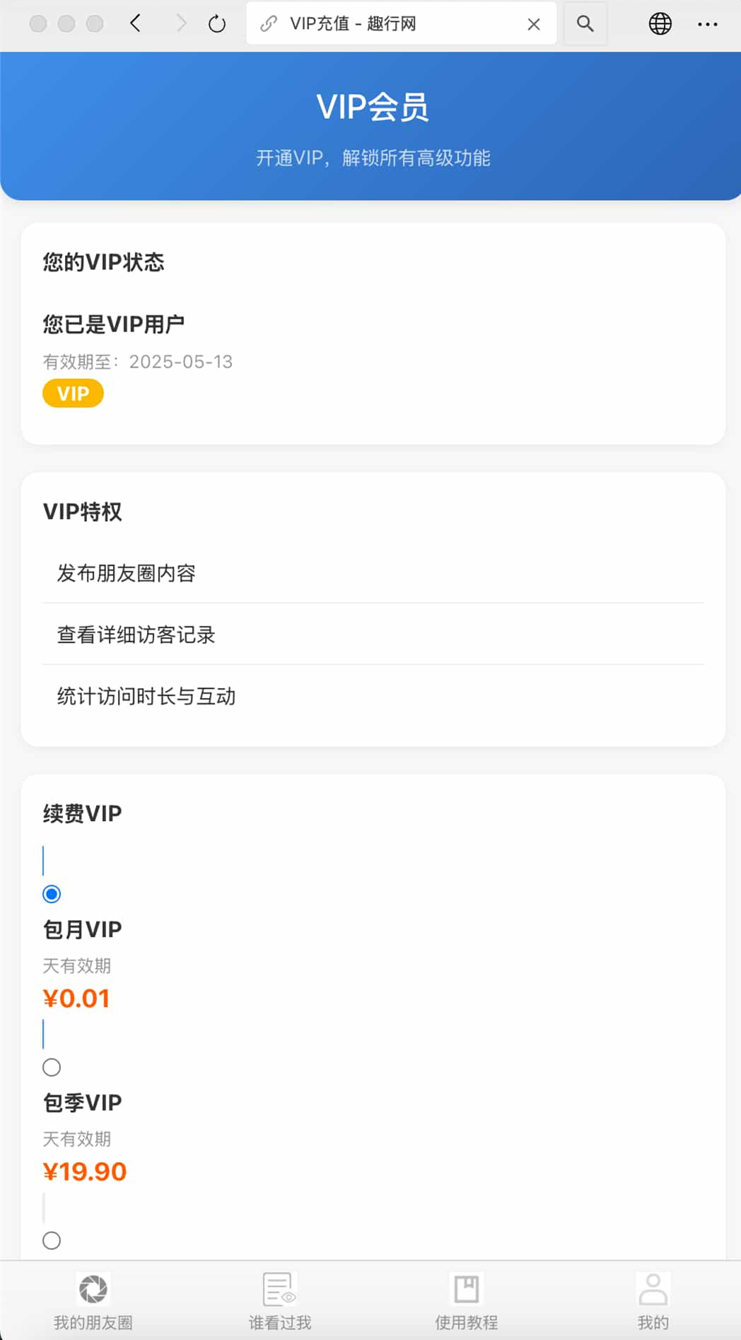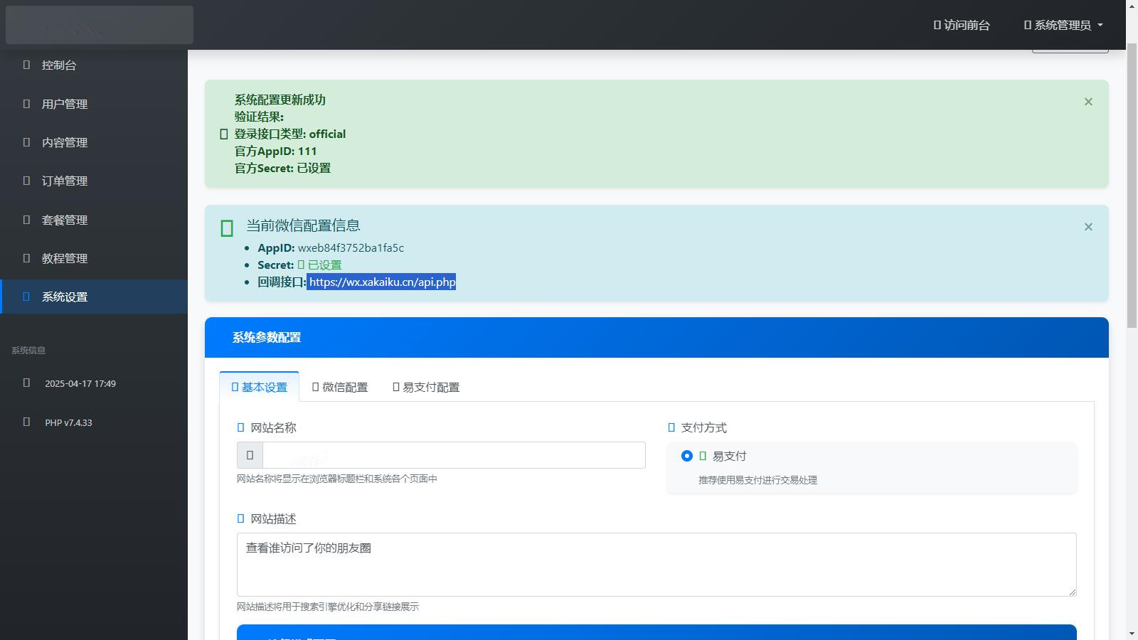这是一套朋友圈访客查询源码,可以查看微信朋友圈的访客记录,打造你的专属访客追踪神器,原理则是通过源码生成一个链接发到朋友圈,当微信好友点进链接之后就会获取TA的微信头像和名字。源码变现方式也很不错,内置VIP会员付费模式,很多人都希望能够查看微信访客记录,因此,只要在自媒体平台发布相关信息,便会吸引这些人开通会员进行测试。测试环境:MySQL5.6,PHP7.0-7.4,安装扩展SG15。源码需要搭配微信服务号使用,已集成微信登录接口和易支付接口,简单四步即可完成搭建,1、上传源码到主机并解压,2、导入MYSQL数据库文件,3、配置数据库参数\config\database.php,4、登录管理后台完成系统参数配置(微信+易支付)。在搭建完成后,需在后台配置微信公众号的信息,可使用公众号回调系统,若不想使用回调系统,可对admin目录下的settings.php进行修改,将其调整为官方设置。