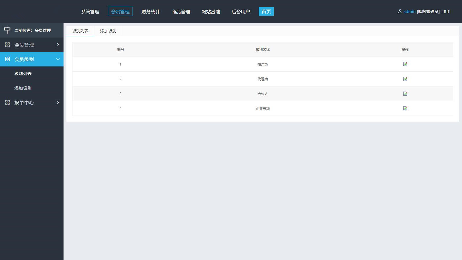 这是一套企业报单分销源码,支持商城功能、三级分销模式和手动报单等功能,支持商品购买的全流程,商品展示、购物车、订单管理、支付接口等,支持自定义添加会员级别、奖励、权限等,手机端完全自适应。源码搭建比较简单,均为常规步骤:1、上传源码到主机并解压;2、导入数据库文件;3、数据库配置文件\include\config.php;4、后台地址:/admin。以前发布的不同版本http://www.txym.cc/1047.html