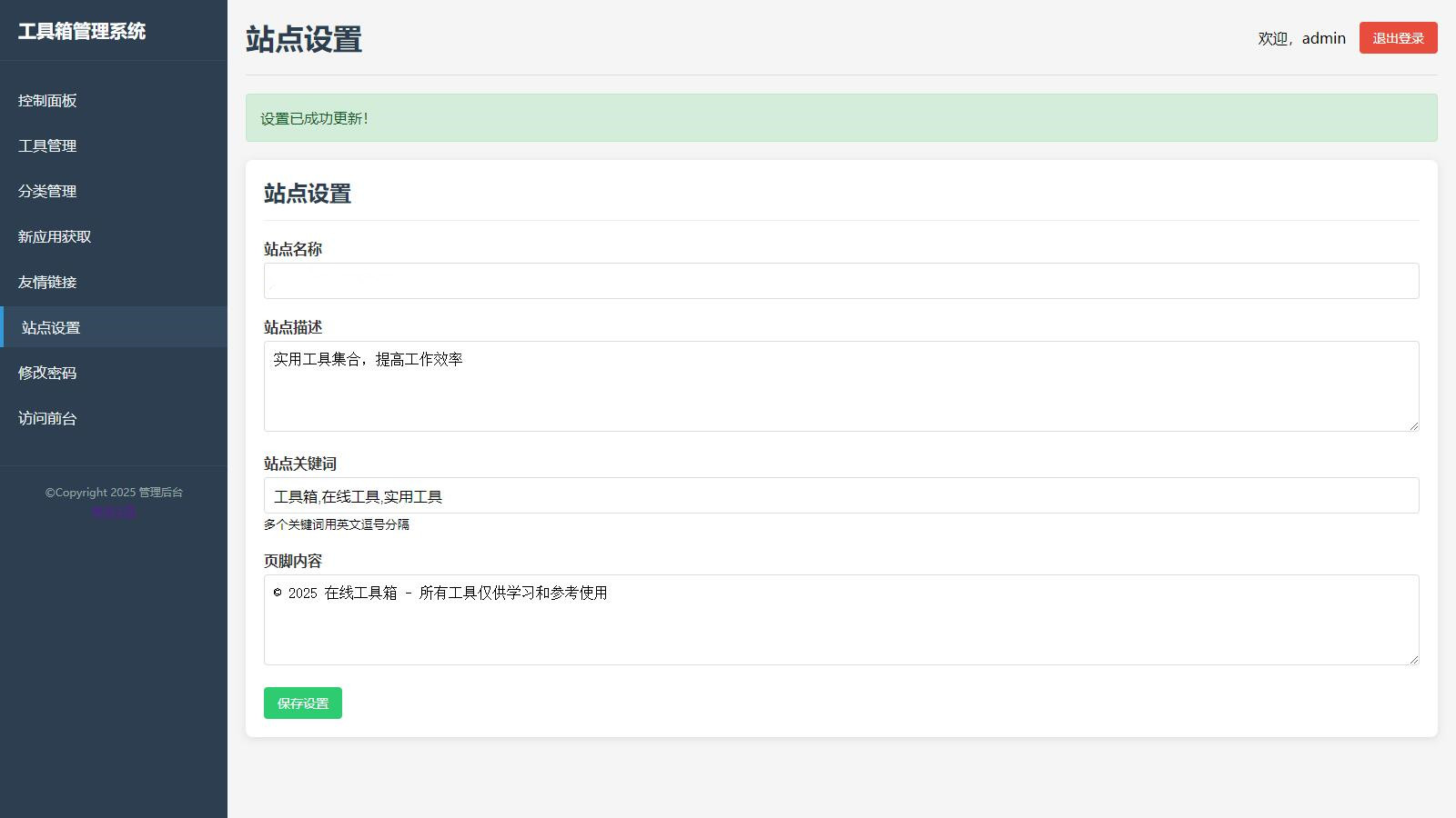 这是一套工具箱源码,自带管理后台,内置多款实用工具,比如端口扫描、图床上传、翻译工具、短剧搜索等,支持自定义分类,比如查询工具、转换工具、安全工具、网络工具等,支持在线搜索,由于采用了第三方API接口,不排除未来失效的可能性(需要手工替换)。