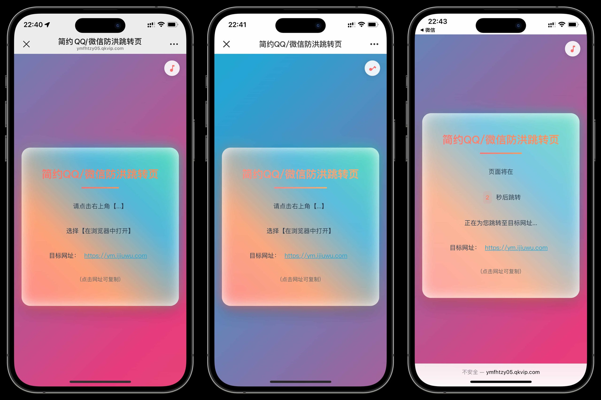 这是一套域名防红HTML源码,检测到微信或QQ打开时会提示右上角打开浏览器,浏览器打开提示倒计时跳转至目标网址,采用的是跳转防红技术,原理则是从A域名跳转到B域名。源码是单页无后台,只有一个HTML文件,支持音乐播放,页面是渐变色(持续变化),上传以后即可使用,域名必须是正常状态(未红状态),因此防封策略是事前防范。