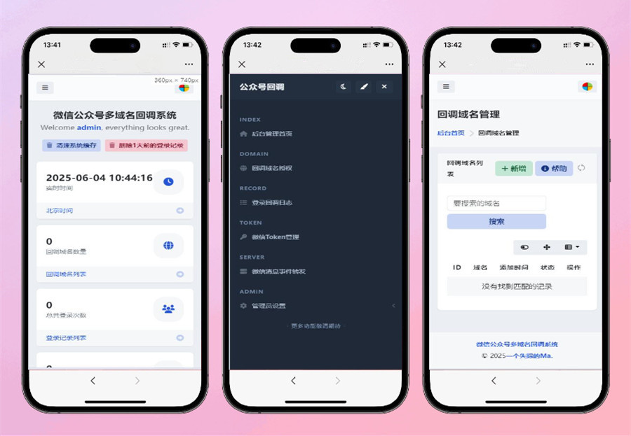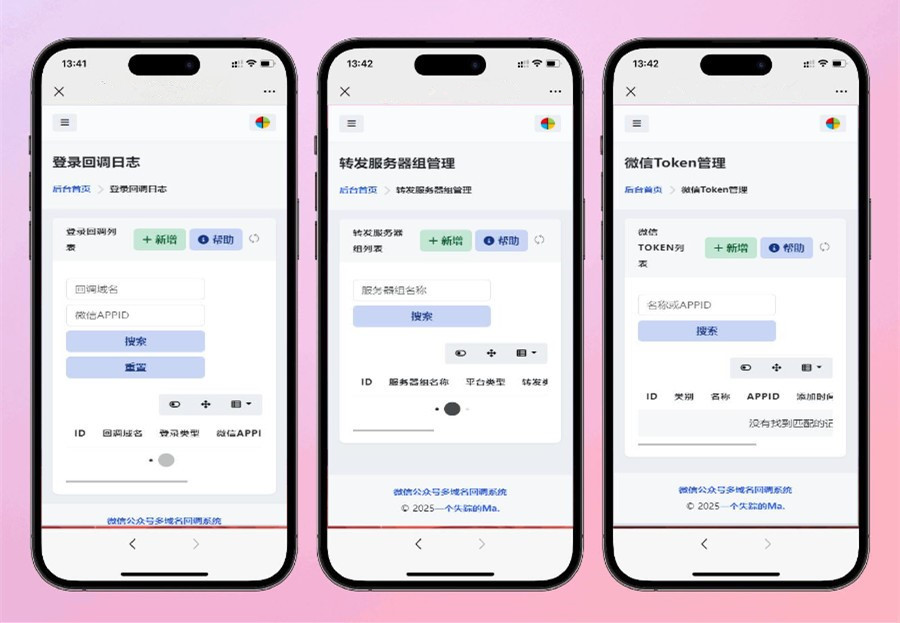 这是一套公众号域名回调源码(美化后台UI),基于ThinkPHP6.0框架开发,突破官方2个域名限制,支持无限域名绑定,后台可视化域名白名单管理,一键启用/停用,同时集成微信AccessToken统一管理中控,解决多业务系统Token冲突问题。测试环境:PHP7.4+,MySQL5.6+,运行目录public,伪静态ThinkPHP,访问域名直接安装。源码内有简单的文本介绍(源码介绍.txt)