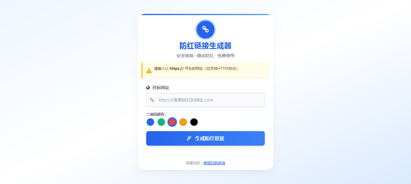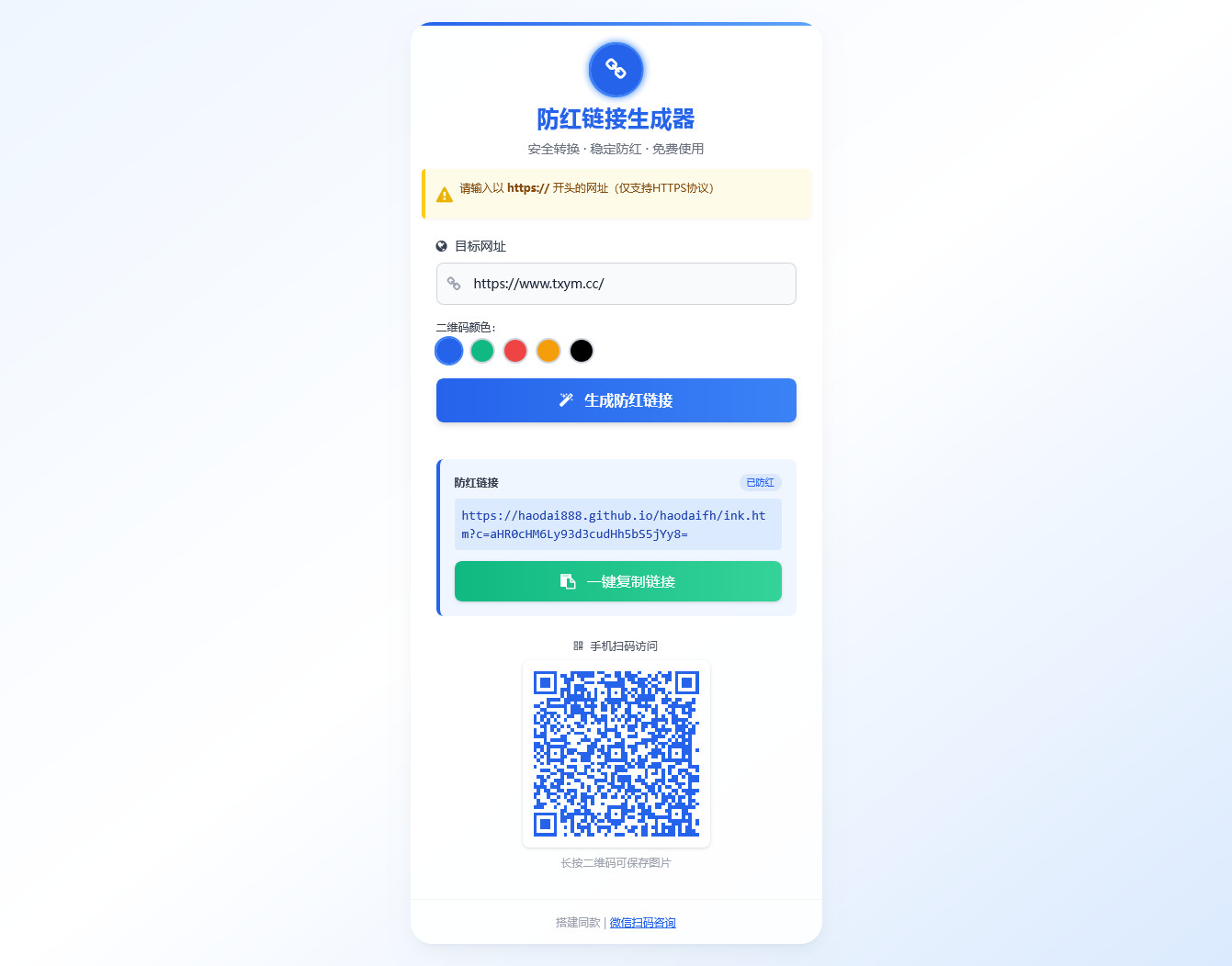 这是一套防红链接生成源码,支持微信直开,手机端完全自适应,仅支持HTTPS协议地址,支持五种二维码颜色,支持手机扫码访问,由于只有一个HTML文件,可以直接在本地使用,虽然内置接口已失效需要替换修复,但是其防封代码的思路仍然值得借鉴。