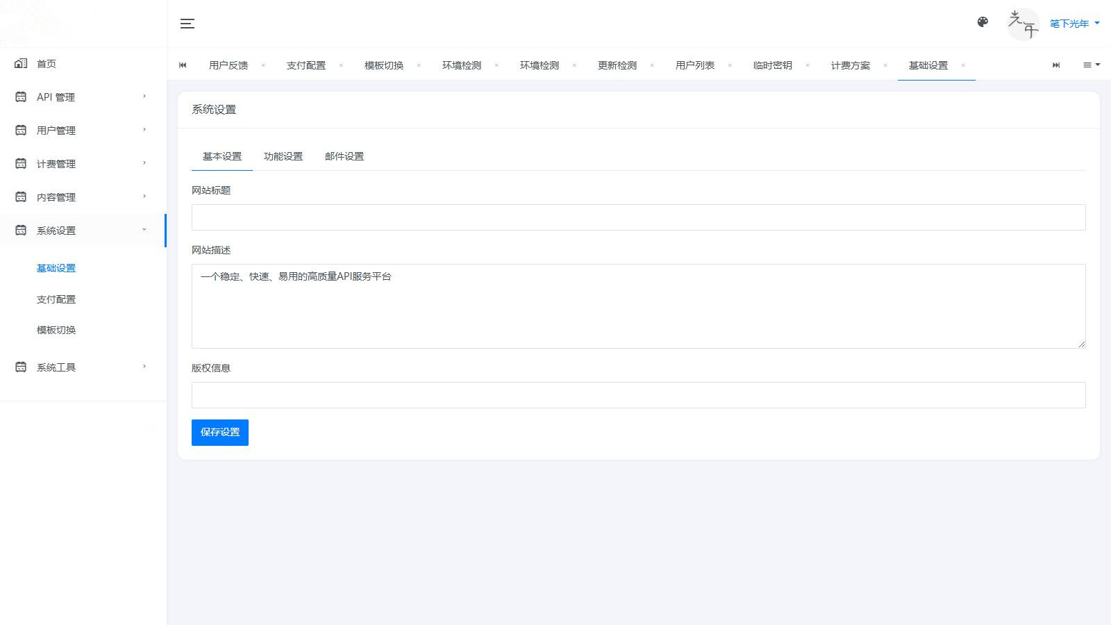 这是一套修复版的API接口管理源码,完全开源支持二开,已经修复多个问题(API鉴权漏洞+邮件标题无法显示等)支持卡密管理,支持在线充值,支持模板切换,支持临时密钥,支持API分类功能,支持结构化接口管理,支持多场景API管理,支持不同计费方案(套餐)等。源码内有简单的文本说明(源码介绍.txt)