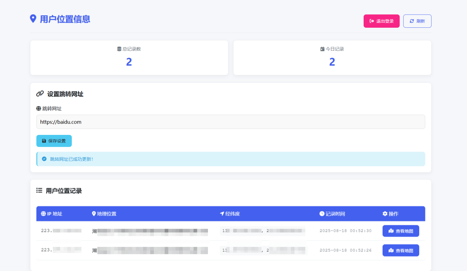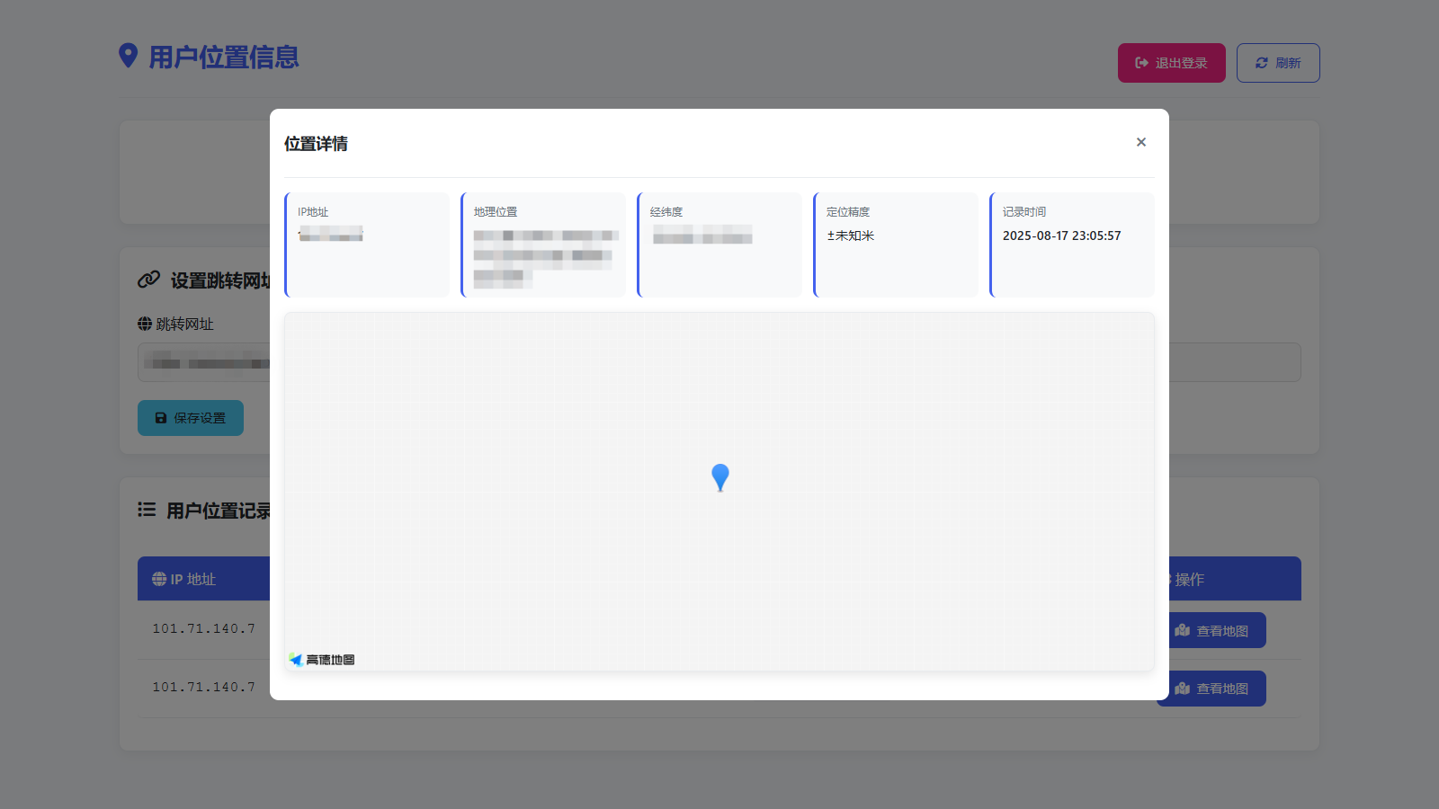 这是一套网页版的手机IP定位源码,轻量化全开源,自带后台无需数据库,定位接口对接的是高德key,通过链接访问获取访问者的手机ip定位,链接可自定义设置跳转目标站点,通过经纬度进行解析定位,精度误差在1公里之内。但是源码不是静默获取定位,点进网页之后会有弹窗提示是否获取定位,如果点拒绝是无法打开对应的目标地址的,点允许就可以正常跳转目标地址,若是做成微信卡片发送,效果可能会更好一些。测试环境:PHP7.4。附带赠送一套相同源码的升级版本(IP定位分销源码),同时也是二开版本,支持分销功能(灰度测试阶段),可以查看下方的源码截图,大小50.0K,解压密码在文件名称里,其中的一个图片文件\uploads\20250823\2025fds65fd4.jpg,由于体积很大(20.4M),已被清理删除。