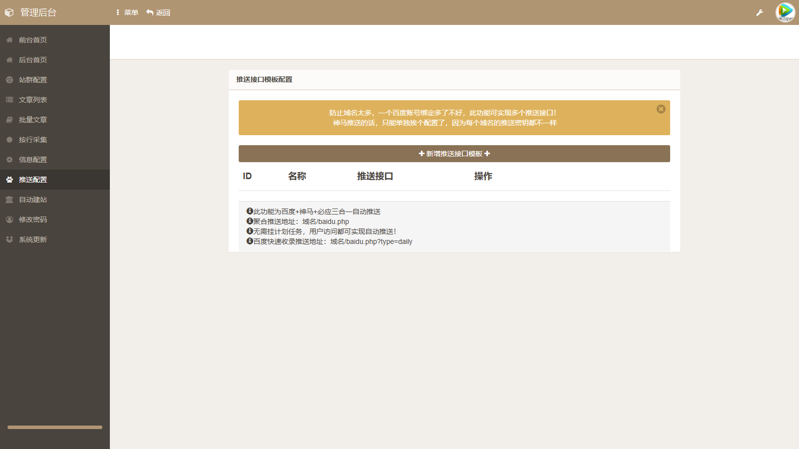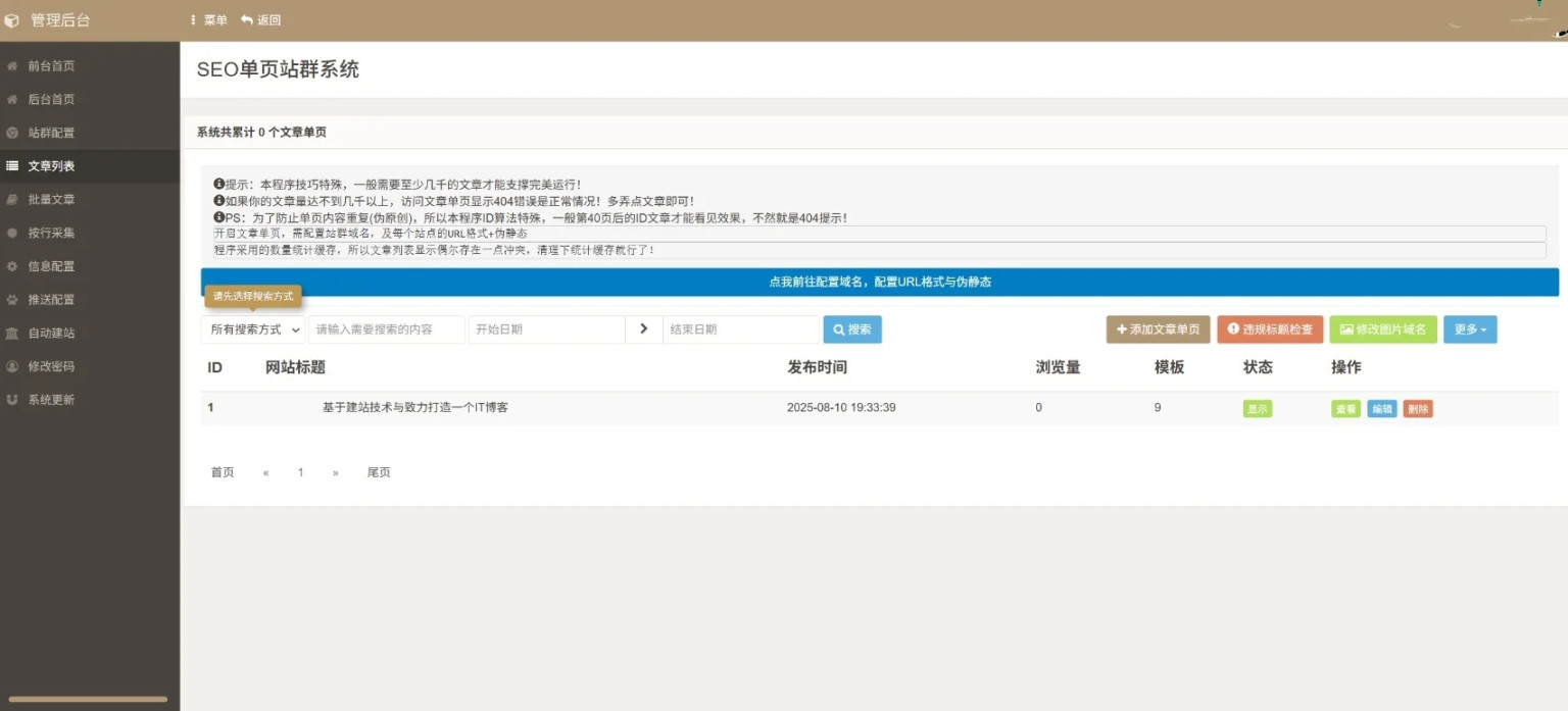 这是一套免授权的静态单页站群源码,网上卖的价格好像挺贵,用途与你想的完全一样,自带几十套单页模板(可以增加和修改),内置百度、必应、头条和神马等聚合推送插件,代码已经全面优化,发布上亿的文章都不会卡顿,不仅单页内容全自动生成,而且ID算法特殊,可以防止文章单页内容重复,支持自动实现标题、关键词和描述等随机组词,支持多个站点绑定同一个目录+数据库使用,且每个站点所展示的单页内容都不一样,同时支持快速改站和套站。测试环境:PHP7.2或7.3,Mysql5.6及以上,直接访问域名安装。源码内有文本说明(源码介绍.txt)