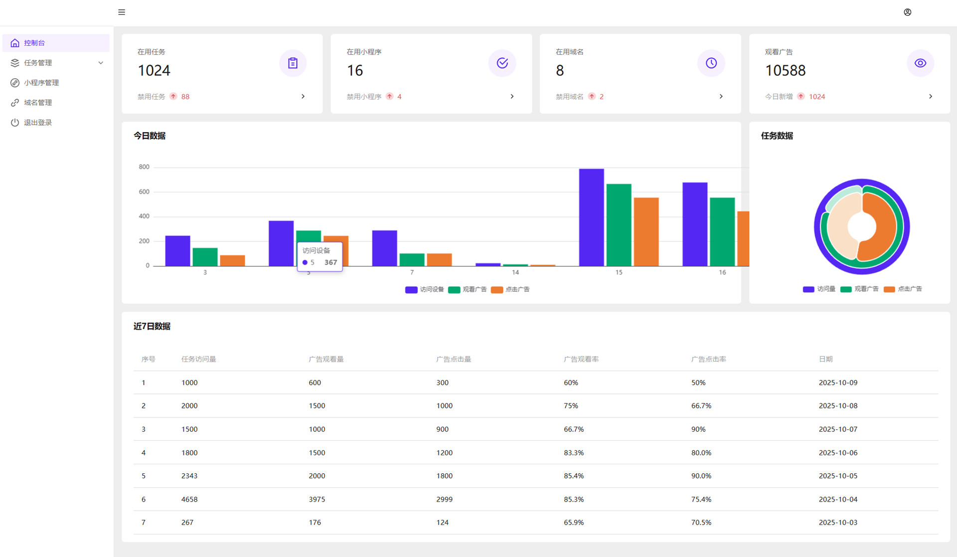 一、技术架构:1、接口管理:PHP+Mysql,2、后台管理系统:Vue3+ts+TDesign,3、任务单页:Vue3,4、小程序:uniapp+Vue2。二、操作流程,1、在Vue3管理后台配置任务参数,2、系统自动生成专属任务链接,3、将链接分享到微信群、朋友圈等私域流量池,4、用户点击链接进入任务页面,5、跳转小程序观看广告视频,6、完成观看后自动发放奖励。三、收入来源:1、微信小程序官方广告,腾讯广告联盟收入分成,2、其他变现渠道,预留扩展接口,支持自定义变现方式。