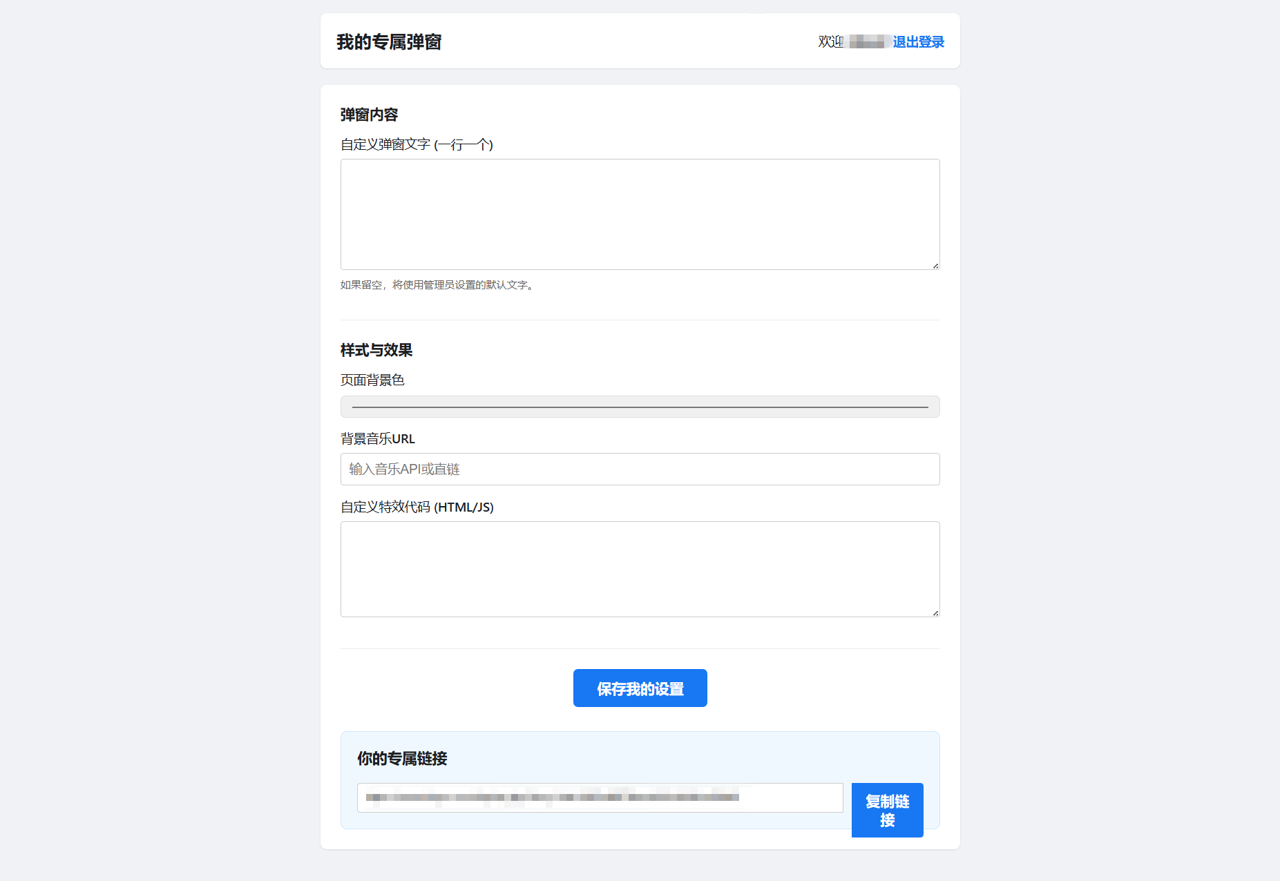 这是一套抖音多用户多弹窗,轻量化无依赖,纯原生PHP+JavaScript开发,主要功能:1、全功能后台:你可以在后台修改自己的登录密码,管理所有弹窗文字(增删改查),自定义全局的背景音乐、背景颜色、弹窗颜色,甚至还能塞点JS特效代码进去。2、独立用户中心:自带完整的用户体系,不只是你自己能玩,用户可以自由注册和登录,然后在自己的面板里,自定义只属于自己的弹窗页面,每个用户都能生成一条独一无二的分享链接。3、权限控制:后台可以精细化管理每个用户,看谁不爽?直接把他账号删了,觉得某个用户太跳?可以一键禁止TA使用音乐、特效或者生成分享链接的功能。4、高度自定义:无论是管理员的全局设置,还是每个用户的个人设置,自由度都拉满了,文字、颜色、音乐、代码,想怎么玩就怎么玩。测试环境:Nginx+PHP8.0+MySQL5.6,数据库配置文件\core\db.php,源码内有文本说明(源码介绍.txt)