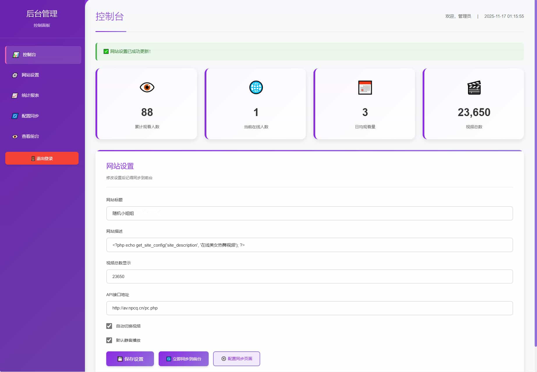 这是一套美女热舞源码,内置第三方API接口(可以替换),支持网站信息修改,支持统计报表功能,手机端完全自适应。图片目录\admin\assets\img\,唯一图片体积很大(20.4M),已被调整图片尺寸,当前大小466K。