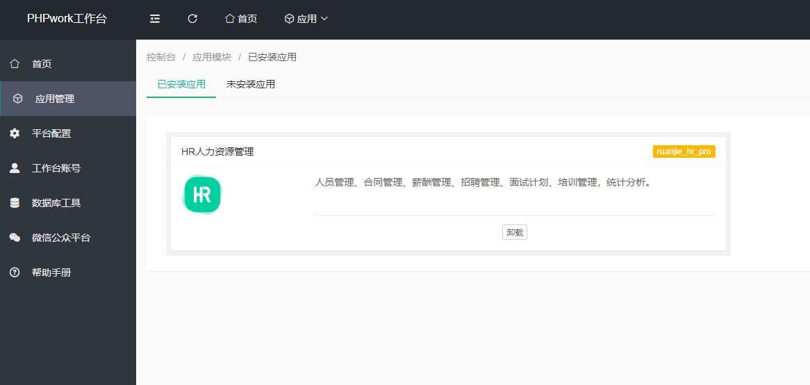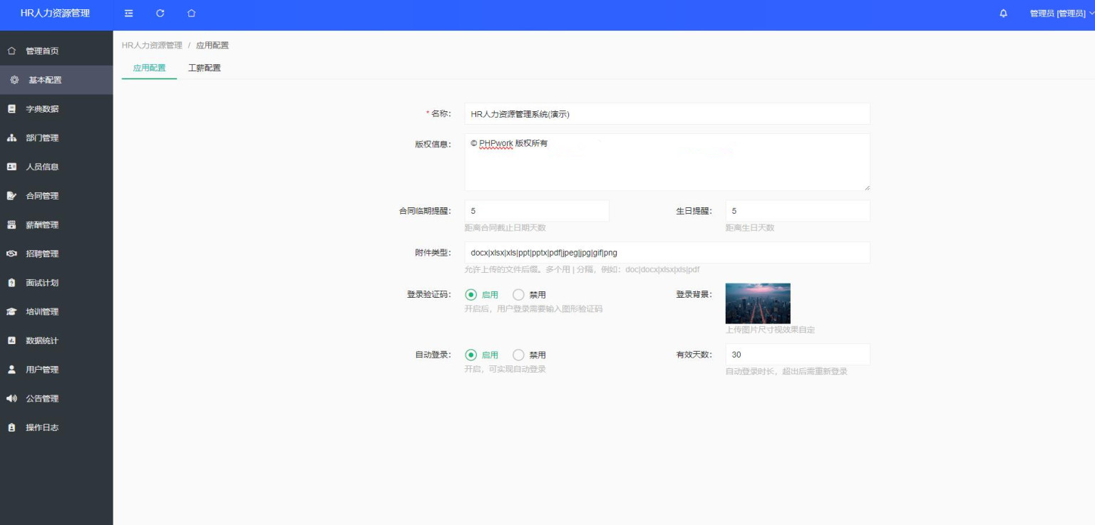 这是一套人力资源管理源码,配置端+管理端,包括员工管理、合同管理、工资管理、招聘管理、面试计划、培训管理、数据统计等基础功能,源码内有文本说明(源码介绍.txt)。测试环境:PHP7.2及以上,MySQL5.6及以上,安装扩展SG15,直接访问域名安装