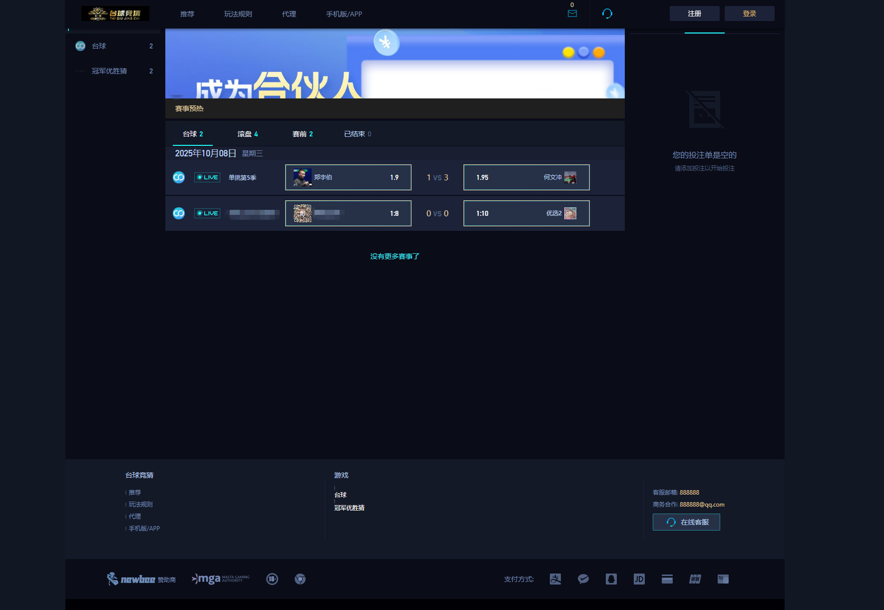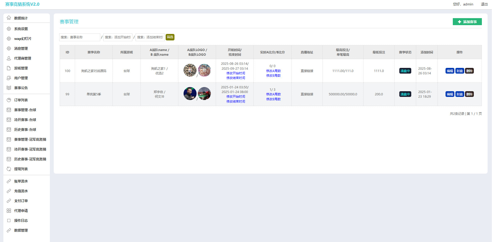 这是一套游戏胜负竞猜源码,支持台球有奖竞猜,支持自定义赛事和赔率,支持冠军优胜猜,集成微信支付与支付宝官方接口(根目录下的wxpay和alipay文件夹),如果不想对接官方支付,自助充值就设置为维护中,联系客服在线手工充值,客服后台可以自定义代码。修改后台密码以后,好像会导致部分系统设置选项隐藏,具体原因需要自己排查一下。