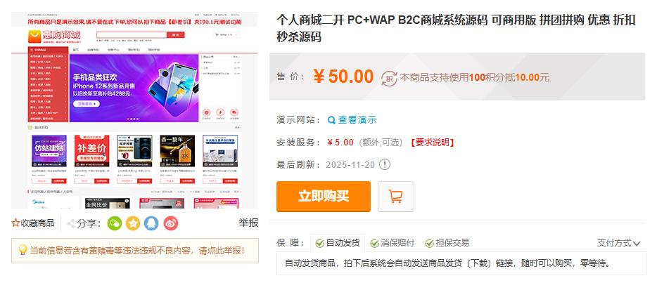 这是一套非常不错的个人B2C商城源码,主要功能:1、支持PC+H5版本(H5版本可以对接公众号进行二次开发);2、支持商品管理,自定义多种规格参数;3、支持拼团活动,自定义商品团购活动;4、支持限时折扣,自定义折扣比例;5、支持优惠券,自定义优惠券可使用商品范围;6、支持会员积分,积分可以抵扣购物金额;7、支持品牌管理,查找商品时按品牌分类检索;8、支持APP套壳,打包自己的专属APP,做到全平台覆盖;9、支持webview形式的小程序,可以直接做成小程序;10、支持支付宝和微信支付(官方接口需要商家版微信/支付宝),网银支付,余额支付等多种支付方式;11、支持订单管理,可直接查看各种状态的订单(待付款,待发货,已发货,交易完成,交易关闭);12、支持退款/退货管理,退货管理清晰明了,不用在海量订单中查找;13、支持打印发货单;14、资金列表,可以查看所有资金动帐明细;15、支持不同等级会员,不同等级会员享受不同购物折扣比;等等。