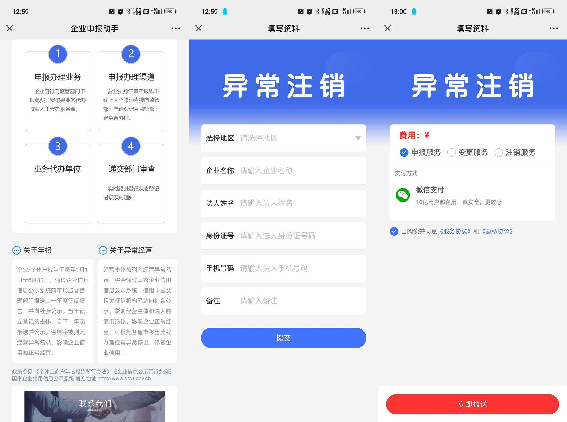 这是一套完整版的工商年报代办源码,主要面向申办流程不熟悉或不专业的,ThinkPHP6.0后端+UniApp前端(H5),前端可直接打包为H5网站,亦可封装为小程序。源码支持用户注册登录,支持企业年报信息填报,支持企业注册信息变更,支持企业经营异常注销等服务,在线支付对接的是微信官方v3,短信通知功能仅限注册/登录,需要下单通知等的可以二次开发。测试环境:PHP8.0,MySQL5.7