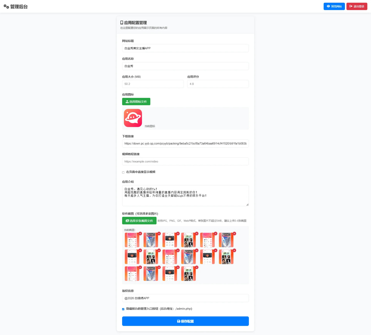 这是一套简约好看的APP推广页面源码,主要用于单个APP的推广、引流和下载,支持后台管理功能,支持添加下载链接,支持配置视频教程链接,支持选择多张应用截图。测试环境:nginx+php7.2,直接访问域名安装,后台地址:/域名/admin.php