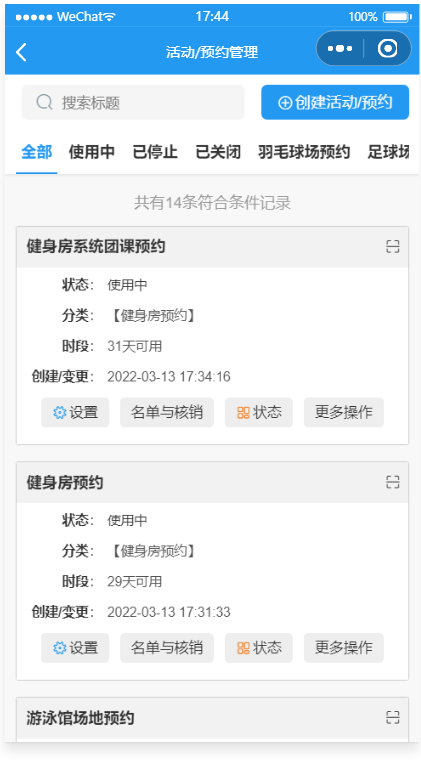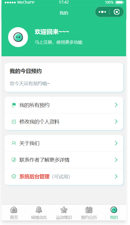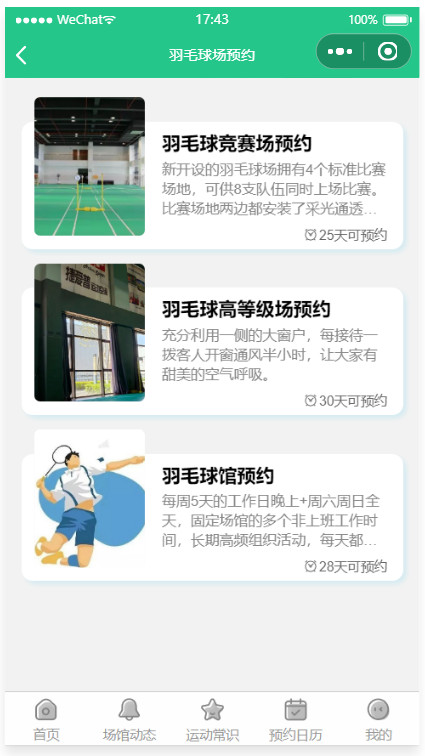 这是一款运动场馆预约小程序,也是面向城市运动预约的工具类源码,基于腾讯的云开发解决方案,主要服务人群为20-45岁运动爱好者,主要功能:场馆动态,运动常识,羽毛球场地预约,足球场地预约,篮球场地预约,健身房预约,乒乓球场地预约,游泳场地预约,网球场地预约,等等,可以按照业者的实际情况进行取舍或者增添场馆类型,既适用于大型综合性文体中心,也适合单一性运动场馆(如羽毛球馆,健身房,乒乓球馆等)。 场馆预约管理:开始/截止时间/人数均可灵活设置,可以自定义客户预约填写的数据项,场馆预约凭证:支持线下到场后校验签到/核销/二维码自助签到等多种方式;详尽的场馆预约数据:支持预约名单数据导出Excel和打印。本款小程序是云开发版,无需服务器和域名。