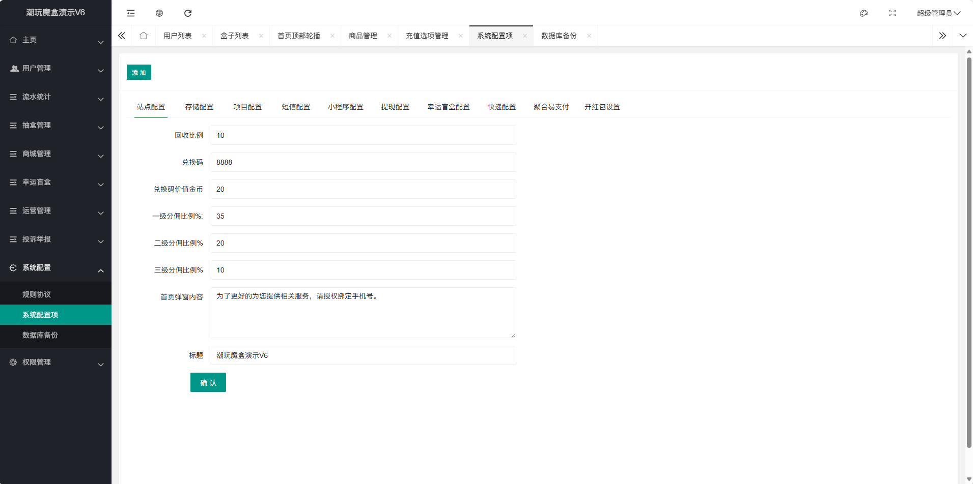 这是一套盲盒源码,前端基于Uniapp开发,支持多端发布(H5、小程序、App等),已完美集成易支付接口,支持微信、支付宝等多种主流支付方式,支持无限回调(无需准备认证服务号),支持抽奖、开盒、奖品展示(实物/虚拟)等核心盲盒功能。前端UI界面1:1高度还原完美复刻,高仿百度网盘的奇妙赏盲盒活动页面,视觉体验和操作流程与官方几乎完全一致,源码内有文本说明(源码介绍.txt)。测试环境:Nginx1.2+php7.2+mysql5.6,安装拓展fileinfo、redis、imagemagick和exif,删除禁用函数