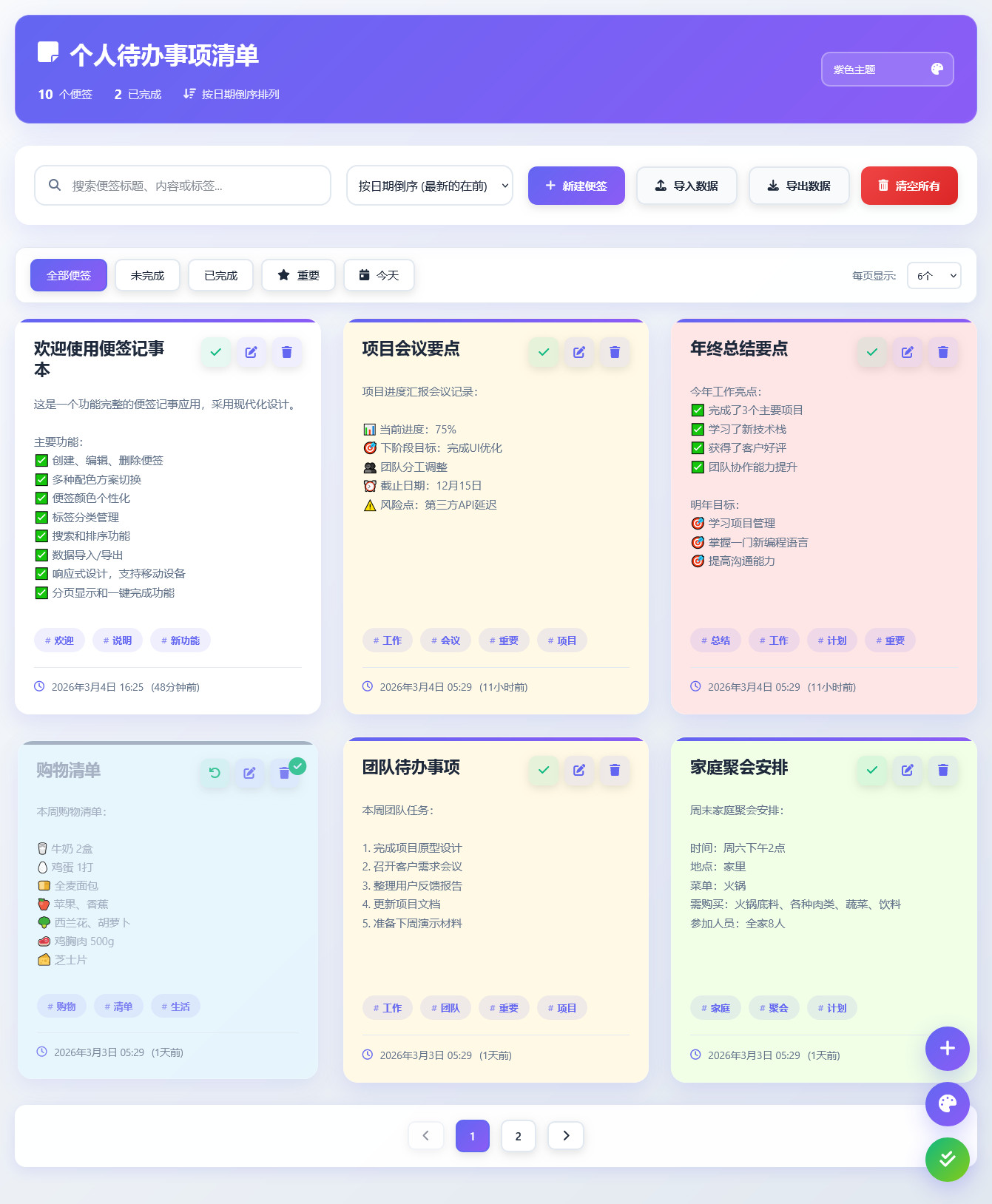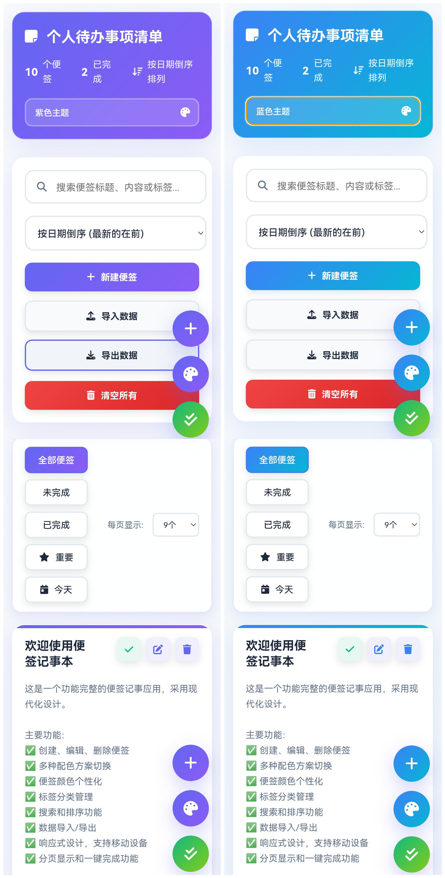 本款安卓APP非常实用,内置15种主题配色(8种主流色+7种混合色),支持导出便签数据(json格式),支持导入便签数据(复制粘贴),支持一键切换主题配色,支持一键完成便签功能,支持一键清空便签内容,支持多种便签排序方式,支持搜索便签标题、内容和标签(即写即搜),支持便签背景色个性化,等等。本款安卓APP是纯本地化应用,无需注册无需登录,完全在本地设备操作(无需联网)。
