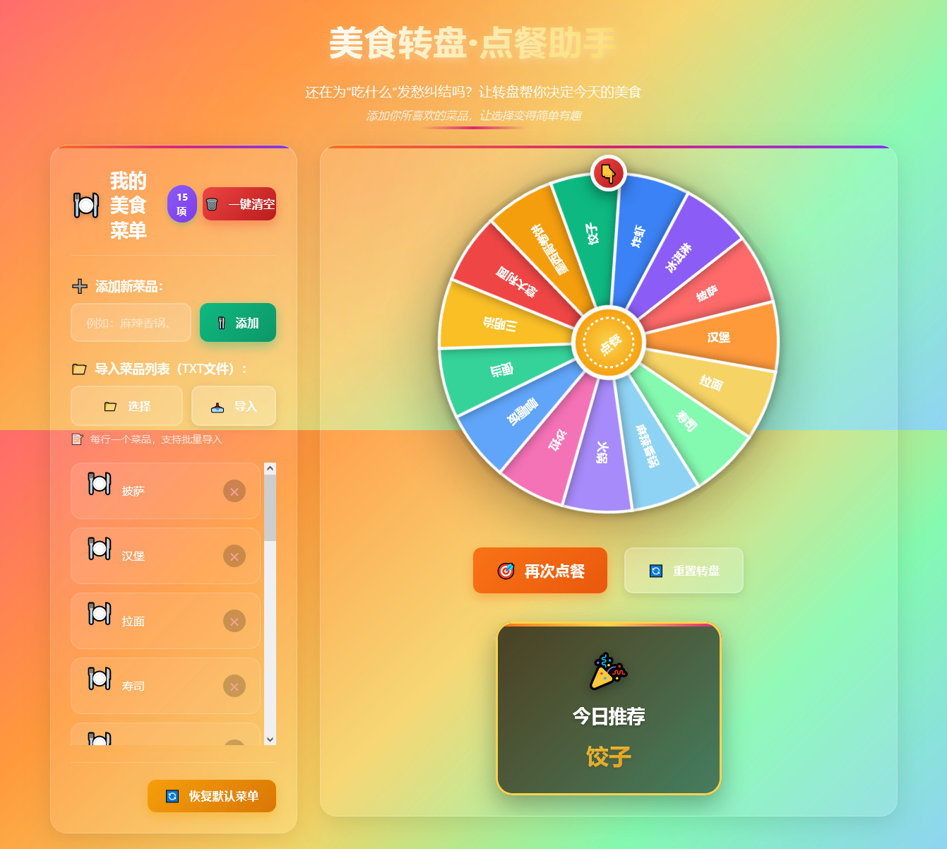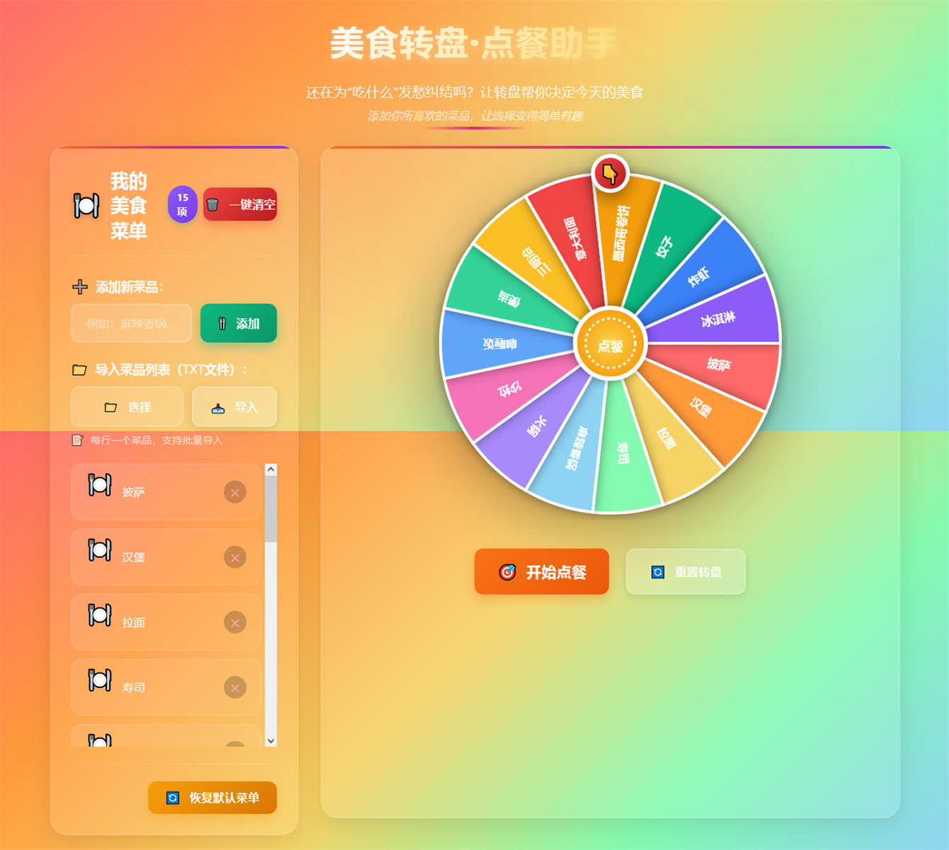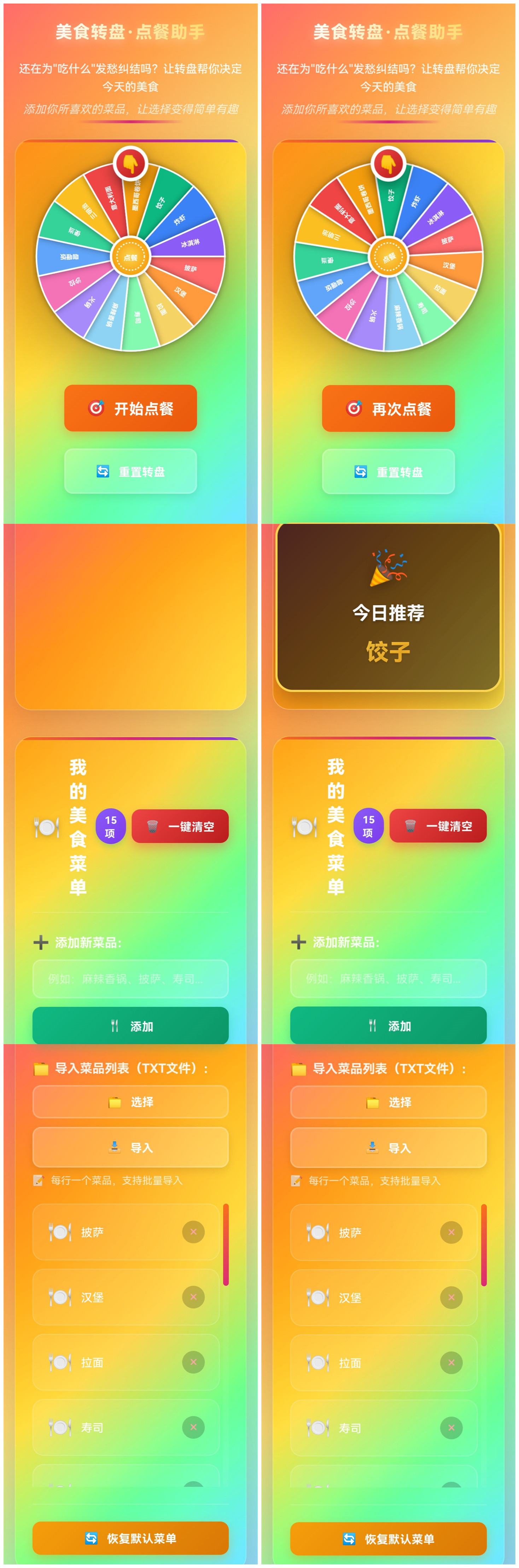 这是一款安卓APP应用(美食转盘),直接在安卓手机里安装使用,专为有选择困难症的朋友设计,可以通过自定义菜品列表,采用转盘随机点餐方式,快速决定自己每餐吃什么,也许概率才是最懂你的。